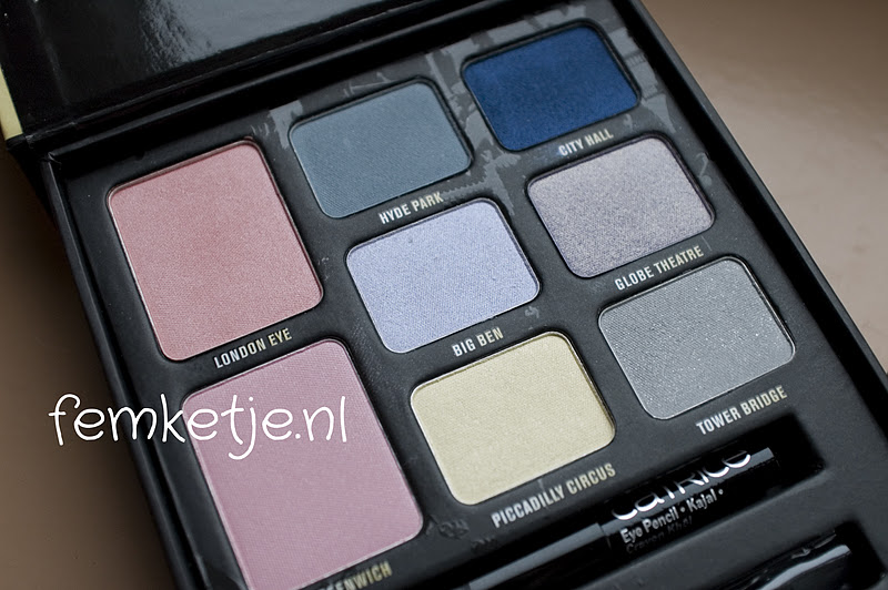 In totaal zitten er twee blushes en 6 oogschaduws in het palette, een zwart oogpotloodje en een dubbelzijdige applicator. Het palette zelf vond ik 1 van de mooiste qua het design van het doosje zelf met o.a. London Eye en de Big ben op geprint.