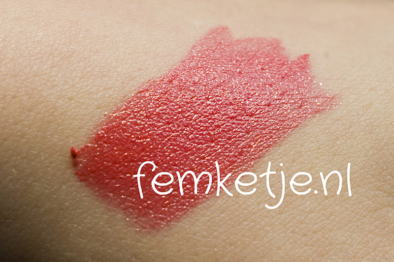 De lipstick heeft een mooie felle oranje rode koraal tint die je in kleur moet opbouwen met een paar laagjes. De lipstick is lekker zacht en creamy en bevat kleine gouden glittertjes die je zelf niet echt op je lippen voelt zitten.