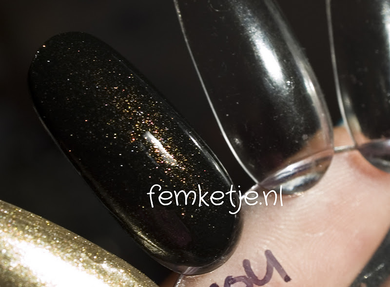 Dit was ook het enige lakje wat me aansprak, ik vond de rest een beetje saai of ik had al een zelfde soort kleur lak thuis staan. Dit lakje heeft een donker zwarte tint met verschillende koperkleurige shimmer in. Het zijn hele fijne glittertjes die eigenlijk geen glitters genoemd kunnen worden omdat het erg fijn is.