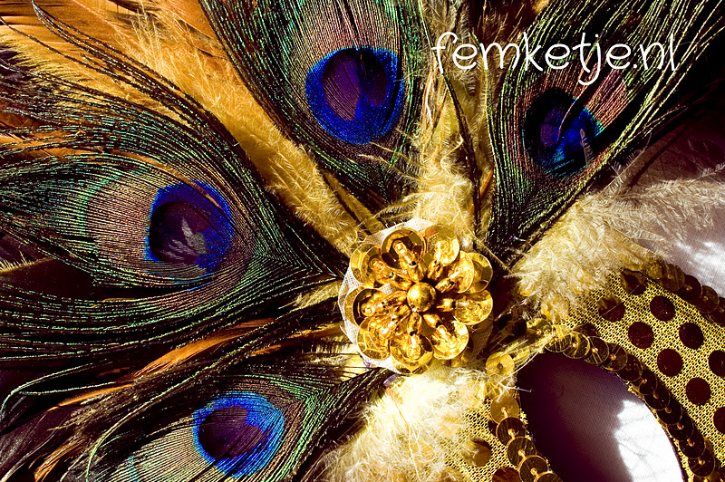 Het maskertje zelf is van redelijk stevig materiaal maar is wel flexibel en neemt makkelijk de vorm van je gezicht aan. Het is wel even wennen om je bewegingen etc. aan te passen aan de grootte van de veren; je hebt ineens een heel breed stuk aan de zijkant van je gezicht, pas dus op dat je de veren niet kraakt doordat je per ongeluk langs mensen of muren schuurt!