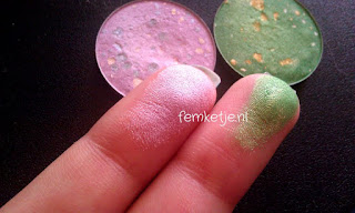 De lila tint bevat een marble van blauw/paarse en lichtroze kleuren en geeft een mooie metallic achtige finish. De groene tint bevat een goude marble en geeft ook een mooie ietwat metallic finish. De kleuren zou ik zelf wel met een basis gebruiken om de kleuren wat intenser te krijgen, anders zijn ze aardig flets maar hebben ze nog wel een mooie finish.