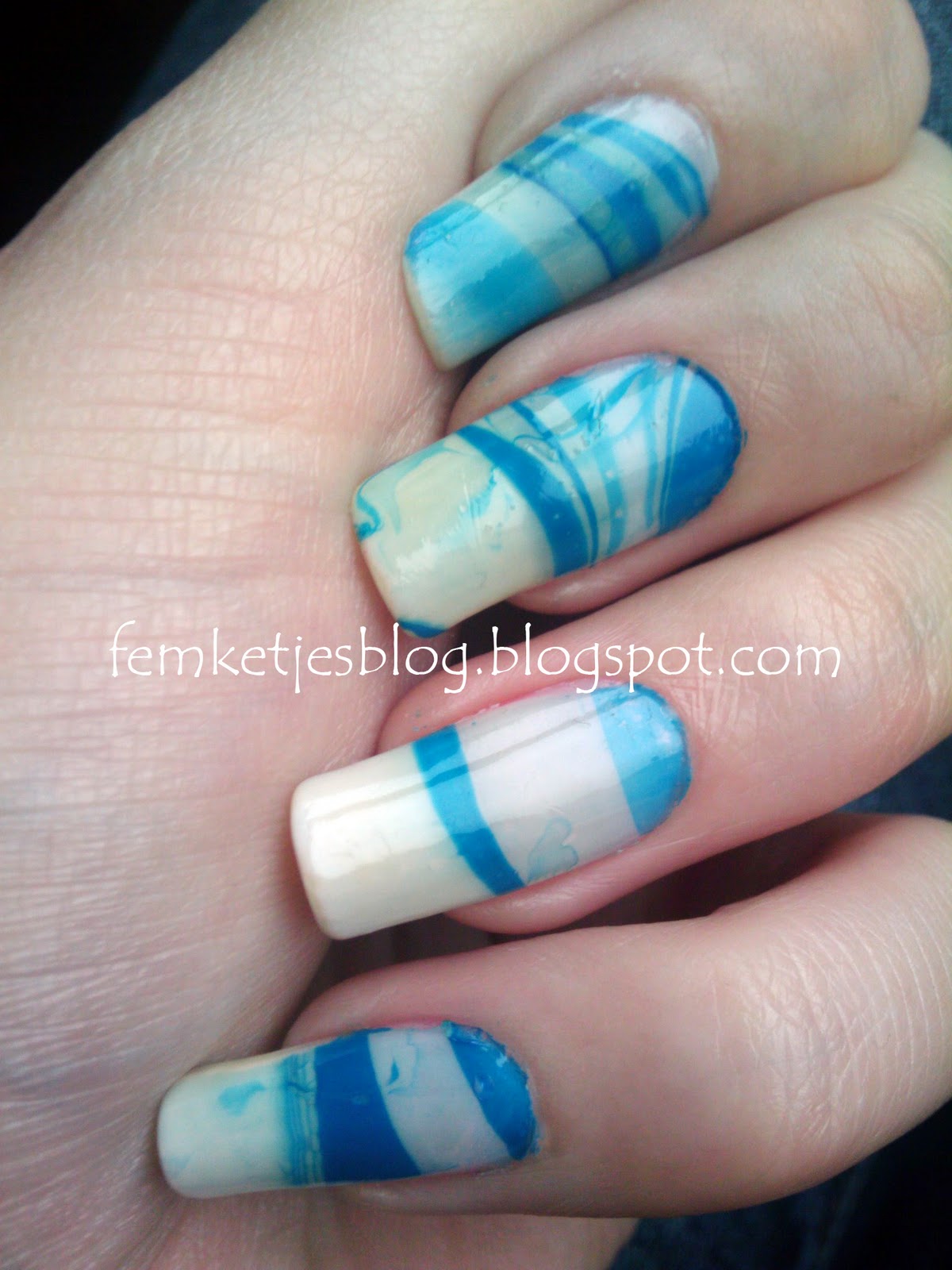 Ik was begonnen zoals altijd, basecoat aanbrengen en laten drogen. daarna nam ik als basiskleur deze witte lak van MNY in 130. Daarna nam ik een schaaltje water en begon te ‘marblen’ (als je niet weet wat marbling nail art is, neem een kijkje op youtube!). Met een sateprikkertje maak je de vorm die je wilt en voila!
