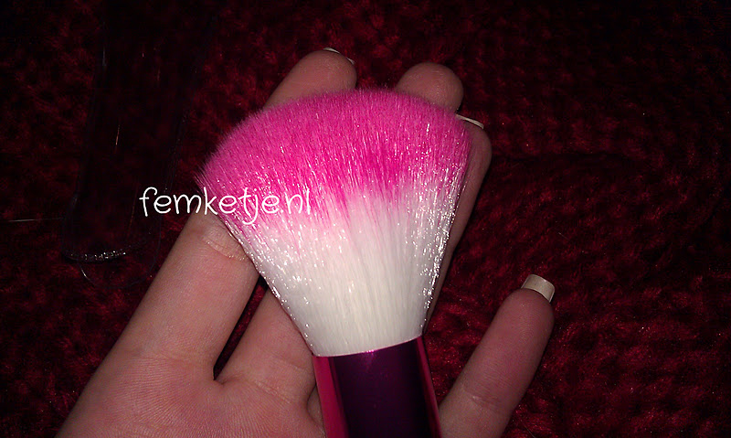 De kwaliteit is niet superdeluxe, dat was ook zeker niet te verwachten voor deze lage prijs. Toch ben ik erg tevreden over de zachtheid en de mooie blendende manier van aanbrengen van blush of bijvoorbeeld highlighter. De haren van de kwast vind ik wel pretty, wit aan de ene kant en roze aan het uiteinde. Ik heb in al die tijd dat ik de kwast gebruik nog niet gemerkt dat ‘ie haren verliest. De haren zijn trouwens gewoon nylon/synthetische haren en voor de rest is de kwast van plastic.